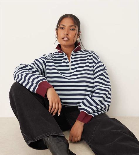 ASOS DESIGN Curve Half Zip Sweatshirt In Blue And Burgundy Stripes-Multi - Multi (Size: 2XL)