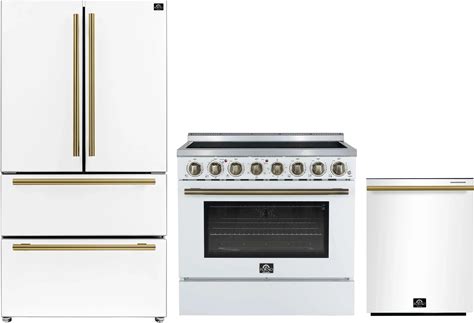 Forno 5-Piece Appliance Package - 30-Inch Inducton Range, Under Cabinet Range Hood, Refrigerator With Water Dispenser, Dishwasher, And 24-Inch Microwave Oven In White With Antique Brass Trim