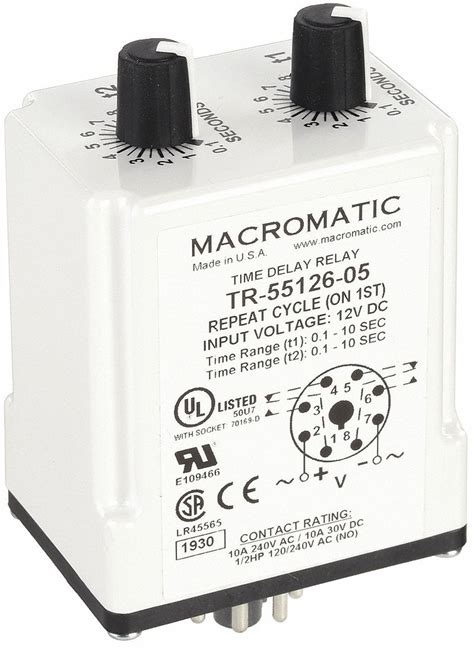 Macromatic Single Function Time Delay Relay: Socket Mounted, 12V DC, 10 A, 8 Pins/Terminals Model: TR-55126-05