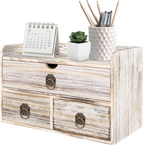 Seekelegant Wood Desk Organizer With Drawer, Vintage Brown Wooden Desktop Organizer, Tabletop Storage Organization Box For Countertop, Home Office