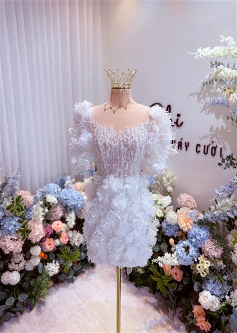 Short White Wedding Dress With 3D Floral Appliques And Veil | Mini Bridal Reception Dress | Custom Handmade Bride Gown