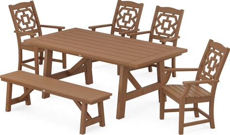 POLYWOOD Chinoiserie 6-Piece Rustic Farmhouse Dining Set With Bench In Teak - Outdoor Furniture