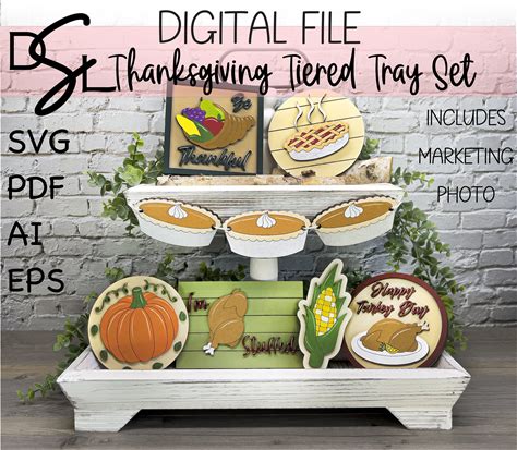 Thanksgiving Tiered Tray Decor Set Bundle Glowforge Digital Laser Cut SVG Autumn Fall Layered Handmade Wood Design AI PDF Pumpkin Pie Turkey